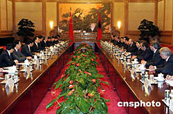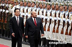 中國(guó)國(guó)務(wù)院總理溫家寶九月十三日下午在北京人民大會(huì)堂東門(mén)外廣場(chǎng)主持儀式,歡迎來(lái)訪的阿爾巴尼亞總理納諾。這是中阿總理三十八年來(lái)的首次會(huì)晤。中新社記者:毛建軍
