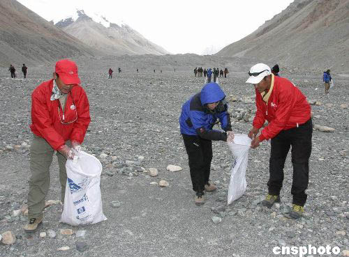 “2004地球第三極珠峰環(huán)保大行動”在珠峰展開清掃工作。作者:范曉麗