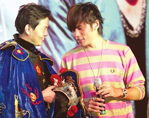 慶功會以京劇《大鬧天宮》開場,各路天王把周杰倫簇?fù)碓谥醒,隱喻“唯周杰倫獨尊”。隨后,川劇大師彭登懷的弟子上臺伴著《我的地盤》表演了變臉。站在臺側(cè)的周杰倫目不轉(zhuǎn)睛地盯著表演者,然后走到表演者身邊左看右看,最后干脆動手搜起身來。聽到觀眾的笑聲,周杰倫很不好意思地說:“等回家再把老師扒光了查!
