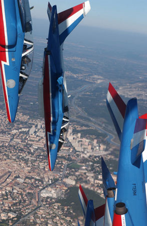 法國空軍的“法蘭西巡邏兵”飛行表演隊(duì)正式成立于1964年2月。飛行表演隊(duì)的飛機(jī)涂著同法國國旗一樣的紅、白、藍(lán)三種顏色,機(jī)群在空中做飛行表演時也常常把著三種顏色的煙跡留在空中。它象征著“自由”(紅色)、“民主”(白色)、“博愛”(藍(lán)色),體現(xiàn)了法國人民勇敢、浪漫的傳統(tǒng)和對未來美好的愿望。圖為“法蘭西巡邏兵”飛行表演隊(duì)作在空中垂直下降動作(來源:艦船知識網(wǎng)絡(luò)版)