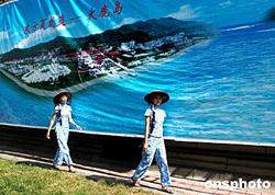 九月遼寧丹東街頭,兩位漁民裝束的女子走過“大鹿島--東方夏威夷”的巨幅掛圖。遼寧省丹東市最大的島嶼大鹿島不僅是該地區(qū)最大的活貝出口集散地,其長灘、細沙、緩坡等自然條件和甲午海戰(zhàn)等歷史遺跡形成避暑觀光的旅游勝地,當?shù)卣畵?jù)此優(yōu)越條件大力招商引資準備進行大鹿島的整體開發(fā)。中新社記者:王麗南