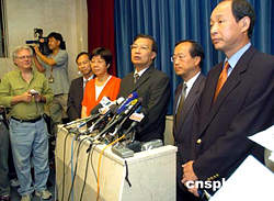 圖為會(huì)后譚耀宗向新聞界作簡(jiǎn)報(bào)。