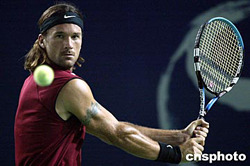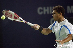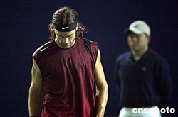 中國網(wǎng)球公開賽男單比賽九月十五日晚在北京網(wǎng)球中心中央球場(chǎng)繼續(xù)進(jìn)行,賽會(huì)頭號(hào)種子西班牙名將莫亞以零比二不敵法國選手特松加,爆出本屆中國網(wǎng)球公開賽最大冷門,無緣晉級(jí)下一輪。中新社記者:盛佳鵬
