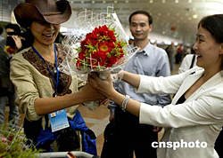 西藏自治區(qū)體育局、中國科學(xué)探險協(xié)會主辦的“珠穆朗瑪峰環(huán)保大行動”圓滿結(jié)束,十六日二十余名志愿者、新聞記者順利返回北京時,興高采烈地在首都機(jī)場合營留念,祝賀活動圓滿結(jié)束。中新社記者:宋吉河
