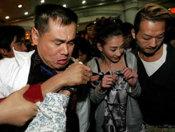 聽(tīng)說(shuō)張美人終于要下樓了,門(mén)口一片沸騰,當(dāng)張柏芝在幾位隨從人員的簇?fù)硐鲁鰣?chǎng)時(shí),現(xiàn)場(chǎng)炸開(kāi)了鍋,尖叫聲一浪高過(guò)一浪。大家的雙臂熱情地伸向張柏芝,快到門(mén)口時(shí),張柏芝身邊一位助手更是把她緊緊摟在懷里,剛到門(mén)口,立刻伸過(guò)來(lái)3只手向張柏芝胸口“進(jìn)軍”,大美女被嚇得花容失色,一位伸手企圖和張柏芝親密接觸的男子更是笑得比花還燦爛。