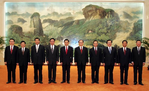下午五時四十五分,胡錦濤、江澤民、吳邦國、溫家寶、賈慶林、曾慶紅、黃菊、吳官正、李長春、羅干等領(lǐng)導(dǎo)來到參加全會的人員中間,同大家親切見面,并合影留念。