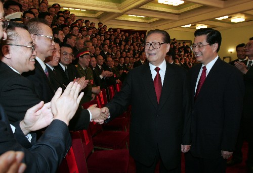講話后,胡錦濤、江澤民親切握手,并向大家揮手致意,全場再次響起長時間的熱烈掌聲。