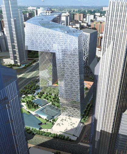 CCTV主樓的兩個(gè)塔樓從一個(gè)共同的平臺(tái)升起,在上部匯合,形成三維體驗(yàn),突破了摩天樓常規(guī)的豎向特征的表現(xiàn)。復(fù)雜的功能包容在內(nèi)部緊密連接的環(huán)路中,體現(xiàn)一個(gè)相互合作、相互依存的鏈條以及自身組織的有序和協(xié)調(diào)。