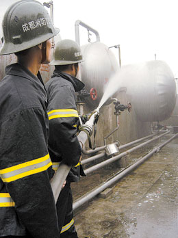 成都市消防支隊(duì)緊急調(diào)集城區(qū)10個(gè)中隊(duì)共40輛消防車(chē)趕往現(xiàn)場(chǎng),并立即啟動(dòng)“104油庫(kù)應(yīng)急預(yù)案”。幾分鐘之后,油庫(kù)周?chē)木用袢砍冯x,接著便看見(jiàn)鳴著警笛的消防車(chē)接連不斷地開(kāi)進(jìn)了油庫(kù)。