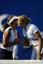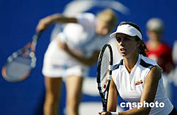 九月二十五日,中國(guó)網(wǎng)球公開賽女子雙打比賽繼續(xù)在北京網(wǎng)球中心進(jìn)行,在中央球場(chǎng)進(jìn)行的女雙半決賽中,俄羅斯選手薩芬娜(右)與瑞士選手加格里亞蒂二比一戰(zhàn)勝中國(guó)選手、雅典奧運(yùn)會(huì)網(wǎng)球女子雙打冠軍李婷和孫甜甜,順利晉級(jí)決賽。作者:盛佳鵬