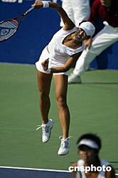 九月二十五日,中國網(wǎng)球公開賽女子雙打比賽繼續(xù)在北京網(wǎng)球中心進(jìn)行,在中央球場(chǎng)進(jìn)行的女雙半決賽中,中國選手、雅典奧運(yùn)會(huì)起網(wǎng)球女雙冠軍李婷和孫甜甜(后)不敵俄羅斯選手薩芬娜與瑞士選手加格里亞蒂組合,無緣晉級(jí)決賽。中新社記者:盛佳鵬