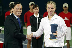 九月二十六日晚,中國(guó)網(wǎng)球公開賽女子單打決賽在北京網(wǎng)球中心中央球場(chǎng)進(jìn)行,美網(wǎng)新后、俄羅斯名將庫(kù)茲涅佐娃一比二不敵賽會(huì)頭號(hào)種子選手、美國(guó)網(wǎng)壇名將小威廉姆斯,屈居亞軍。圖為比賽結(jié)束后北京市長(zhǎng)王岐山(左)為庫(kù)茲涅佐娃頒發(fā)亞軍獎(jiǎng)杯。中新社記者:盛佳鵬