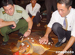 這只雌性綠海龜體長(zhǎng)1.1米,寬0.8米,重達(dá)83公斤,背面及腹面角板均有色澤的斑紋,表面呈橄欖色,并有多種貝殼化石附著點(diǎn)綴其間,煞是好看。據(jù)水產(chǎn)部門(mén)介紹,該海龜系國(guó)家二級(jí)重點(diǎn)保護(hù)水生野生動(dòng)物,主要分布于中國(guó)臺(tái)灣、福建和海南等沿海一帶海域。作者:陳如冰