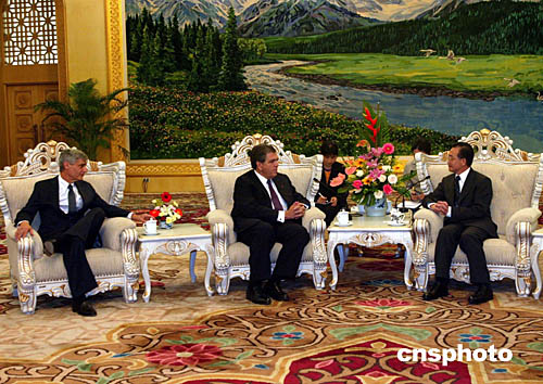 溫家寶會見美國花旗集團首席執(zhí)行官普林斯(中)和美國前財長魯賓一行。