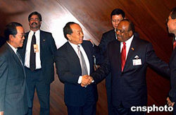 當?shù)貢r間九月二十八日,正在紐約聯(lián)合國總部出席第五十九屆聯(lián)大的中國外長李肇星,會見了巴布亞新幾內(nèi)亞外長納馬柳(右一)。作者:趙海燕