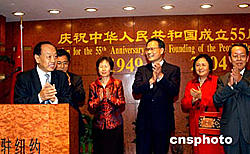 | 當(dāng)?shù)貢r(shí)間九月二十九日晚,正在紐約聯(lián)合國(guó)總部出席第五十九屆聯(lián)大的中國(guó)外長(zhǎng)李肇星(左)前往中國(guó)駐紐約總領(lǐng)館,與當(dāng)?shù)貎S胞共同歡度中華人民共和國(guó)成立五十五周年。圖中從右至左為:中國(guó)常駐聯(lián)合國(guó)代表王光亞和夫人、中國(guó)駐紐約總領(lǐng)事劉碧偉和夫人、中國(guó)常駐聯(lián)合國(guó)副代表張義山。作者:趙海燕