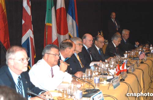 美國財(cái)長斯諾(左)與美聯(lián)儲(chǔ)主席格林斯潘(右)1日參加G7與中國的首次部長級(jí)對(duì)話會(huì)。中新社記者:余東暉