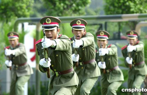 駐澳部隊?wèi)?zhàn)士表演刺殺團體操,展示了精湛的軍事技術(shù)。作者:梁永強