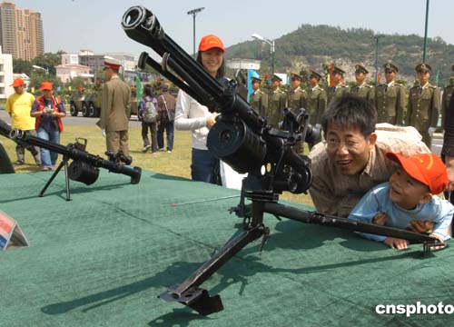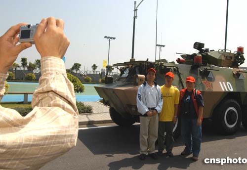 進入營區(qū)參觀的市民最大興趣的是,觀看軍事科目表演和部隊武器裝備展示,他們紛紛在裝甲車前拍攝留念,對武器裝備更是愛不釋手。