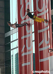 穿上時(shí)尚品牌ESPRIT 2004秋冬運(yùn)動(dòng)時(shí)裝的模特,10月4日在香港尖沙咀美麗華商場(chǎng)外墻舞臺(tái)上表演,展示優(yōu)美姿態(tài),為該品牌運(yùn)動(dòng)系列宣傳。作者:洪少葵