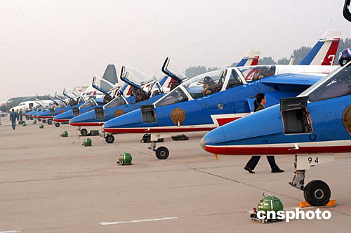 十月六日,法國空軍“法蘭西巡邏兵”特技飛行表演隊訪華巡回表演準備就緒。中新社記者:鄒憲