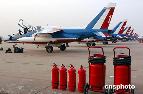 “阿爾法”噴氣機整齊地停在北京南苑機場停機坪上,旁邊預備了消防設備。