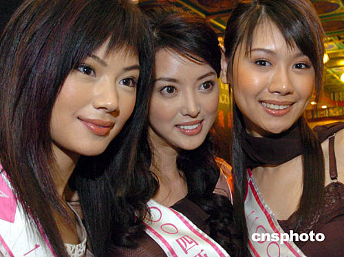 圖為來自香港的候選佳麗鄭穎(右一)、韓國候選佳麗河少英(中)和內(nèi)地候選佳麗陳海甌在發(fā)布會上。