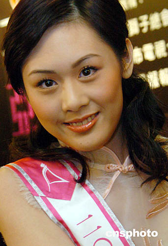 圖為選自香港的候選佳麗黃淑玲在發(fā)布會上展示風(fēng)采。