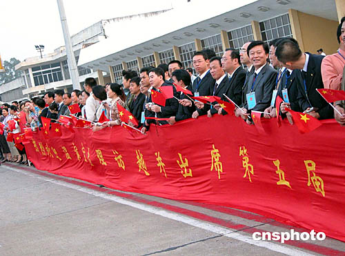 十月六日傍晚,中國總理溫家寶抵達河內開始對越南正式訪問。中國駐越使館工作人員、華僑、留學生手持國旗,打出橫幅熱烈歡迎溫家寶總理訪問越南。作者:吳慶才