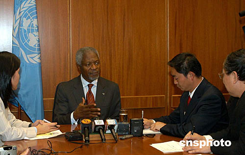 中新網(wǎng)聯(lián)合國(guó)10月6日電(記者 陳建)聯(lián)合國(guó)秘書長(zhǎng)安南有望今秋訪華。美東時(shí)間十月六日下午,他在紐約聯(lián)合國(guó)總部接受了中國(guó)記者的聯(lián)合采訪。安南說(shuō),在他的日程表上,有三件事最緊要:法治、改革、發(fā)展。
