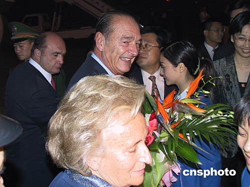 法蘭西共和國總統(tǒng)雅克·希拉克一行于八日晚22時抵達訪華首站--四川省成都市,在雙流國際機場,受到了中國國家副主席曾慶紅、中共四川省委書記張學忠等官員的熱烈歡迎。希拉克總統(tǒng)應中國國家主席胡錦濤邀請,來華進行為期五天的國事訪問。作者:楊杰