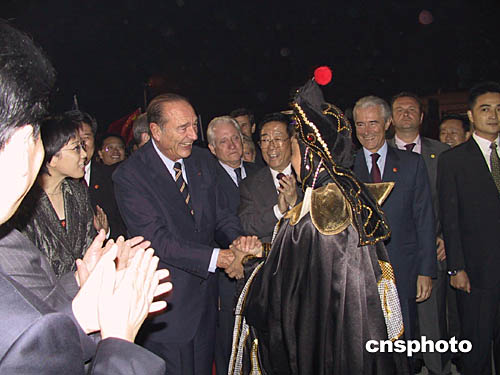 法蘭西共和國總統(tǒng)雅克·希拉克一行于八日晚22時抵達(dá)訪華首站--四川省成都市,在雙流國際機(jī)場,受到了中國國家副主席曾慶紅、中共四川省委書記張學(xué)忠等官員和各界人士的熱烈歡迎。對川劇界人士表演的變臉等川劇絕活,希拉克總統(tǒng)興味甚濃,頻頻停下腳步與他們交談。作者:楊杰