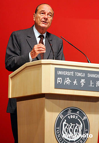 在對(duì)同濟(jì)學(xué)子的演講中,希拉克說(shuō),文化對(duì)話使人人享有獲取知識(shí)的平等權(quán)利。他表示,法國(guó)在世界經(jīng)濟(jì)強(qiáng)國(guó)中名列前茅。在知識(shí)與創(chuàng)新方面,走在時(shí)代前列。他說(shuō),歐洲無(wú)數(shù)重要科技進(jìn)展都是法國(guó)倡導(dǎo)的。