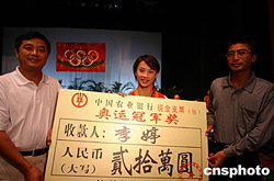 廣西自治區(qū)政府十月十一日在南寧舉行慶功會(huì),獎(jiǎng)給第二十八屆奧運(yùn)會(huì)女子十米雙人跳臺(tái)冠軍李婷三十萬元人民幣。桂林一家企業(yè)獎(jiǎng)給李婷二十萬元人民幣和一套價(jià)值百萬元人民幣的別墅。廣西另一名獲得獎(jiǎng)牌的運(yùn)動(dòng)員周密也獲得政府獎(jiǎng)勵(lì)十萬元人民幣。作者:蔣雪林