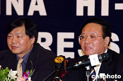 十月十一日下午,第六屆中國國際高新技術(shù)成果交易會(huì)組委會(huì)向媒體記者發(fā)布信息,有來自加拿大、俄羅斯、美國、德國、韓國等二十一個(gè)國家和國際組織組團(tuán)參加本次盛會(huì)。圖為商務(wù)部副部長魏建國(右)信息產(chǎn)業(yè)部副部長婁勤儉向記者發(fā)布“高交會(huì)”信息。作者:陳文