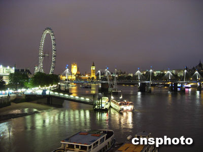 倫敦泰晤士河夜景。圖左環(huán)形物為大型觀光摩天輪“倫敦眼”,前方拉索橋為紀(jì)念英女王伊莉莎白二世就位半世紀(jì)的“黃金五十周年”大橋,遠(yuǎn)處矗立的尖頂建筑為大本鐘。余瑞冬 攝