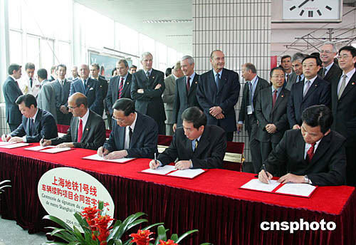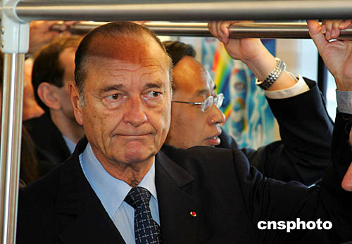 十月十二日,法國總統(tǒng)希拉克參觀、乘坐上海軌道交通三號線,并見證“上海地鐵一號線車輛續(xù)購項目合同簽字儀式”。上海申通集團有限公司將購置一百二十八輛中法合作生產(chǎn)的地鐵車輛,二十二個月后這些車輛將陸續(xù)投入營運。作者:潘索菲