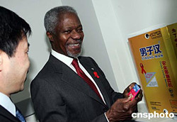 正在北京訪問的聯(lián)合國(guó)秘書長(zhǎng)安南十月十二日參觀艾滋病自愿咨詢監(jiān)測(cè)點(diǎn)時(shí),親自試用即將安裝在賓館、酒店等公共場(chǎng)所的安全套售販機(jī)。中新社記者:毛建軍