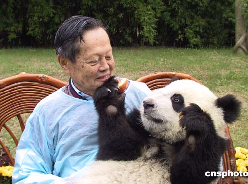 10月14日上午,世界著名物理學(xué)家、諾貝爾獎(jiǎng)獲得者楊振寧抵成都大熊貓繁育研究基地參觀,并與憨態(tài)可掬的大熊貓合影留念。作者:張華