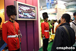 十月十四日,二零零四重慶秋季房地產(chǎn)展示交易會在重慶市展覽中心開幕。此次房交會共有二百一十家單位參展,參展項目一百七十三個,面積達(dá)九百二十七萬平方米。各商家在宣傳上也是各出奇招,招徠看房者。圖為一歐式樓盤展臺邊立著兩名英國禮兵,吸引不少市民目光。作者:郭晉嘉