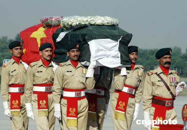 王鵬的靈柩上覆蓋著中巴兩國(guó)國(guó)旗,上面擺放著由鮮花組成的兩個(gè)花圈,在低沉悲涼的哀樂(lè)聲中,巴基斯坦陸軍儀仗隊(duì)為這位在人質(zhì)事件中遇難的中國(guó)朋友舉行了莊嚴(yán)肅穆的遺體告別儀式。6名巴基斯坦禮兵將靈柩慢慢抬起,沿著紅色的地毯,緩緩走向運(yùn)送遺體的專(zhuān)機(jī)。