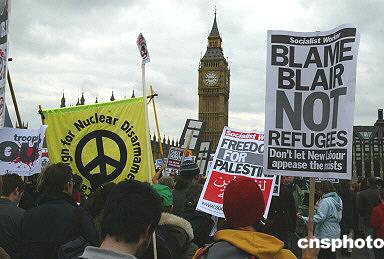 示威者高舉的大型標語就不下數(shù)百,其中有“我們要和平,不要戰(zhàn)爭”;“撤回駐軍”;“停止以色列恐怖主義,解放巴勒斯坦”;“打倒工黨帝國主義”“打倒布什”以及“布萊爾必須下臺”等等。