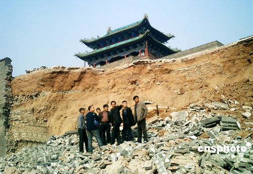 當(dāng)?shù)卣块T緊急在現(xiàn)場調(diào)查此事,研究維修方案。經(jīng)過平遙縣文物部門的現(xiàn)場初步鑒定,此次城墻坍塌缺口長十七米,高十米,緊臨南城門。