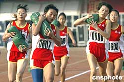 田徑比賽中的六十米五人抗洪搬沙包賽也顯示出了農(nóng)運(yùn)會貼近農(nóng)民生活的特色,圖為女子六十米五人抗洪搬沙包賽中福建的五位參賽選手奮勇爭先。作者:盛佳鵬