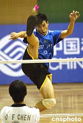 在毽球比賽中,精彩場面不斷呈現(xiàn)。圖為男子單打比賽中四川參賽選手躍起進(jìn)攻。作者:盛佳鵬