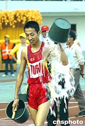 五分鐘五十米抗旱提水保苗賽跑成為一個特色的比賽項(xiàng)目,同時(shí)也是和農(nóng)民生活非常接近的一個比賽項(xiàng)目,要求參賽選手在規(guī)定的時(shí)間內(nèi)盡可能多的提水。圖為一位順利完成比賽的選手將水桶里的水倒在身上慶祝。作者:盛佳鵬