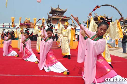 第二屆澳門媽祖文化旅游節(jié),二十二日在澳門天后宮隆重揭幕,并舉行了氣勢恢宏的媽祖祭祀大典,在“平安曲 ”中藝員起舞頌媽祖 。作者:梁永強