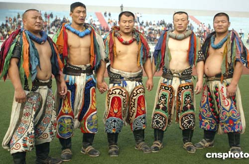 按蒙古族傳統(tǒng),摔跤手上身穿牛皮或帆布制成的“著德格”袖臂蓋背,邊沿鑲有銅釘或銀釘。腰系“來布爾”(即圍巾),下身穿肥大“班斯勒”(即摔跤褲),是用三十二尺或十六尺白布制作的專用摔跤褲,外套有花色的套褲,腳蹬蒙古靴或馬靴。頸套五色綢穗制成的“景嘎”,標志著獲勝次數(shù),名次越多,彩條依次增加。