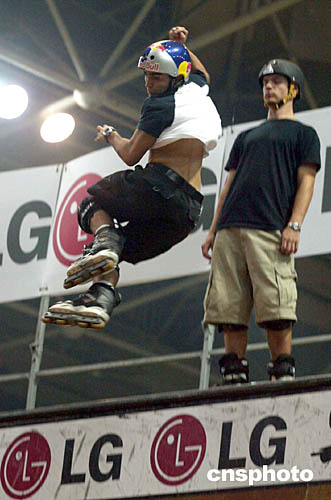 LG極限運動亞洲巡回賽結(jié)束上海的比賽后,二十三日移師北京并于二十四日結(jié)束賽事。來自全球極限運動的頂級高手參加了比賽,此次比賽為北京極限運動愛好者提供了一次難得的欣賞國外高手競賽的機會。此次比賽共有單排輪滑、自由式小輪車、滑板比賽。中新社記者:任海霞