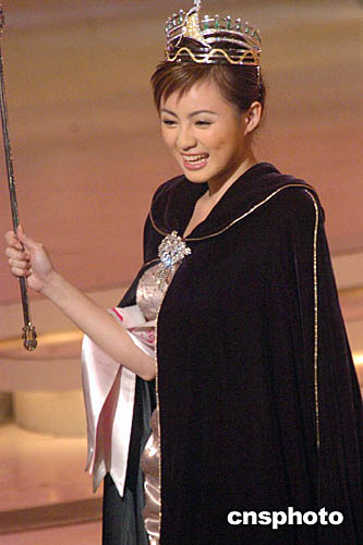 2004亞洲小姐競選總決賽,于十月二十四日晚在香港演藝學院舉行,來自杭州的佳麗呂晶晶奪得桂冠后,將權杖任意揮舞有失莊重。中新社記者:錢興強